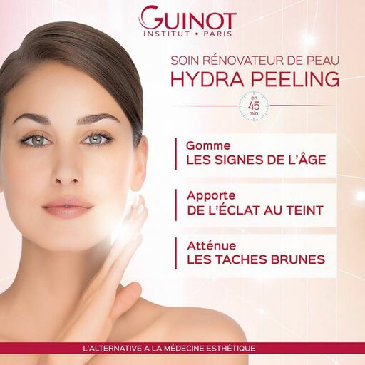 Objectifs du soin Pour faire peau “neuve” en seulement 45 minutes, Guinot a créé le Soin Hydra Peeling dont le protocole est adapté à la sensibilité de votre peau : Le Peeling Hydra PH pour toutes les peaux ; Le Soin Hydra Peeling rénovateur de peau s'inscrit comme une véritable alternative à la Médecine Esthétique pour : Gommer les signes visibles de l’âge. Apporter de l’éclat au teint. Atténuer les taches brunes. Éclaircir le teint.