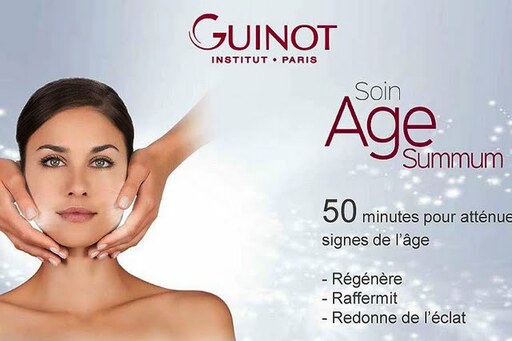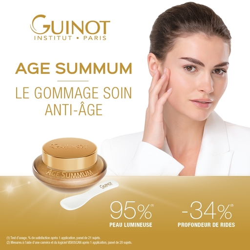 Objectifs du soin Expert en soins anti-âge, Guinot crée le soin qui agit à tous les niveaux de l’épiderme pour gommer les signes de l’âge : rides, manque de fermeté, taches brunes, perte d’éclat. Le Soin Age Summum associe technologie et gestuelles exclusives pour un résultat visible. Dès la fin du soin, la peau paraît visiblement plus jeune et les signes de l’âge sont atténués.